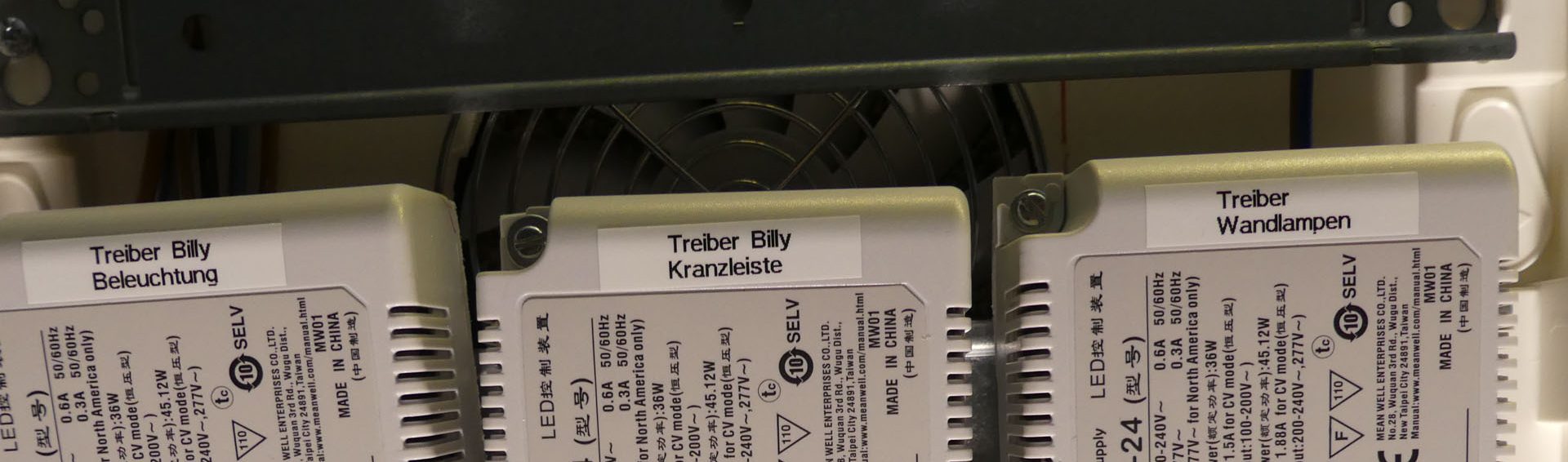 Die Eltako Funkaktoren schalten und dimmen die Meanwell Vorschaltgeräte. Das Eltako System hat mich begeistert. Es lassen sehr mehrere Sender auf einen Aktor einlernen. Die von mir genutze Fernbedieung vom Typ FMH8 benötig zudem keine Batterien – ganz clever erzeugt die Fernbedienung durch Tastendruck selbst die benötigte Energie um Funktelegramme zu senden (Piezoeffekt). Eigentlich hatte ich am Anfang gar nicht vorgesehen, mehr als zwei getrennt schaltbare Beleuchtungen zu installieren. Nach Fertigstellung der Regalwand testete ich, wie sich eine Kranzbeleuchtung macht und kam zu dem Entschluss, dass dies sehr gut aussieht. So ist die ursprünglich geplante Installation noch etwas gewachsen. Die Bilder stellen die momentane Installation dar. Mittelfritig werde ich die Eltako FSG71/1-10v wahrscheinlich gegen Eltako FAM14 mit FSG14/1-10V (für die zentrale Installation schon vorgesehen) ersetzen, da die Installation durch ein weiteres Projekt weiter zu wachsen droht.